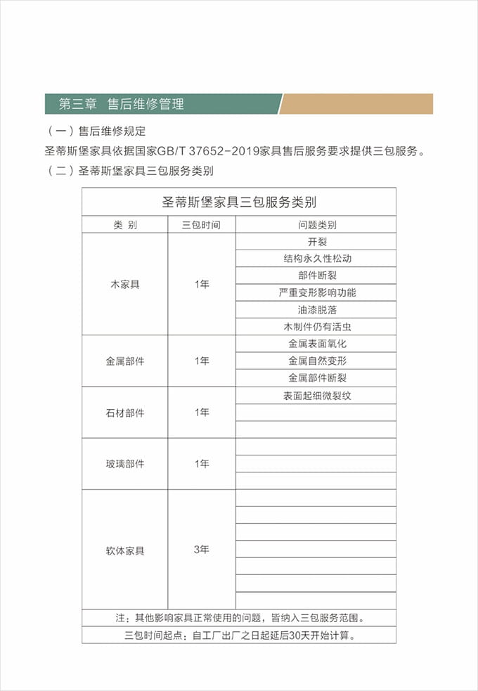维修人员上门维修处理问题上门前必须着圣蒂斯堡统一工作服,佩戴上岗证并尽量携带维修处理过程中可能会使用到的工具和备用配件例:工具、备件、笔记本、手套、脚套、收据和《圣蒂斯堡售后服务信息单》等物品。