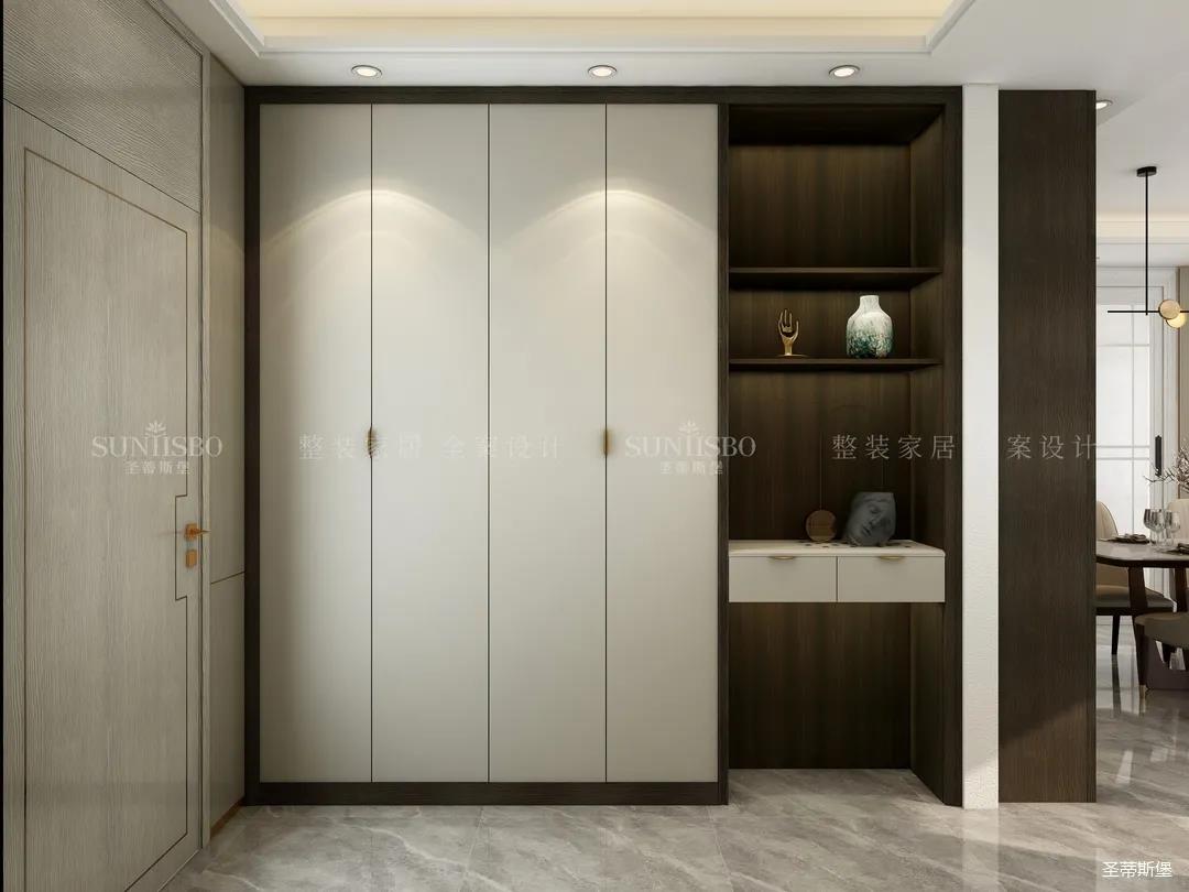 次卧的对称极简主义让人拥有奢华、简约居家质感。倒梯形的几何床头柜和奢华的水母造型床头灯,都让空间散发着华贵的魅力。嵌入式的立面衣橱,运用不同的材质将极简的协调效果达到极致,收纳空间层层分区,让每一件物品都有迹可循。