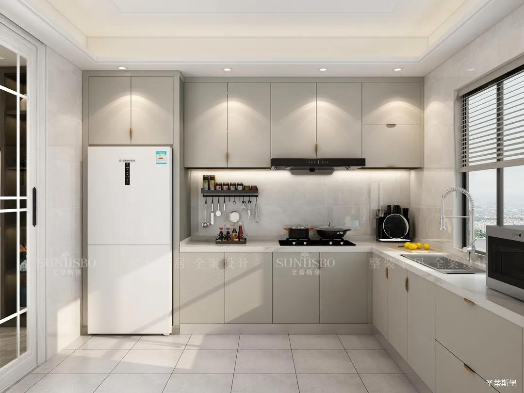 客餐厅、厨房的极简风格和谐统一,鉴于现代家庭中日益增加的厨房电器设备,设计师在用厨动线上颇为用心,L型的动线将生活习惯自然的融入整体家居之中。保持着中性简约的调性,运用温润的实木材质与刚毅的线条,营造出摩登时尚的氛围。将厨房区域自然融入整体家居之中。保持着中性简约的调性,用温润的原木材质或是圆润的曲线线条,平衡空间的冷峻。